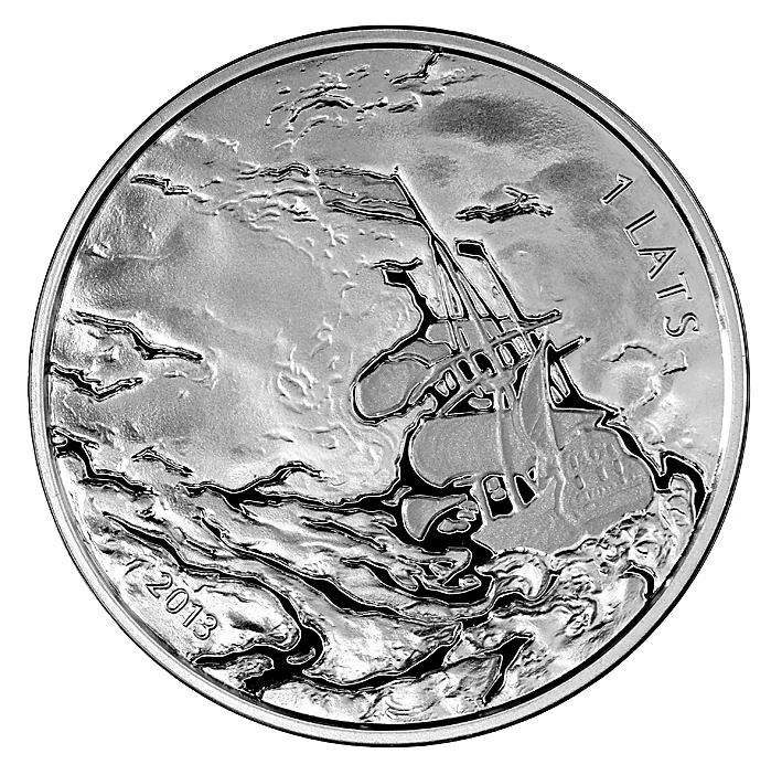 The Bank of Latvia issued this "Rihards Vāgners" coin to mark the composer's 200th birthday and his formative period in Riga. There, while working on his first major opera "Rienzi," he drew innovations from the local theater—now Wagner Hall—such as the sloped seating, darkened auditorium, and deep orchestra pit, which later influenced his Bayreuth theater. The obverse features a sailing ship on rough seas, with "1 LATS" to the right and "2013" at the bottom left.