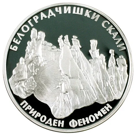 The reverse depicts the Belogradchik Rocks with circumferential inscriptions.