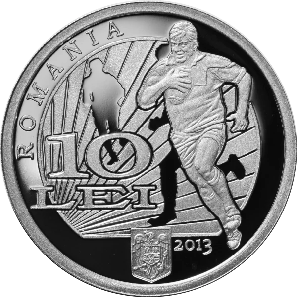 A stylized rugby scene, "10 LEI", Romania's coat of arms, "2013", and the arched text "ROMANIA".