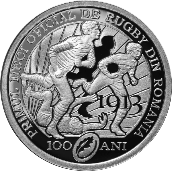 Romanian Rugby Federation logo with a historical match illustration, noting "100 ANI" and "PRIMUL MECI OFICIAL DE RUGBY DIN ROMANIA 1913."