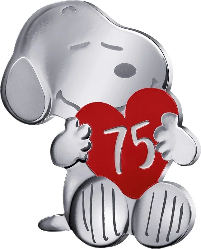 Snoopy serre un cœur gravé du chiffre 75, en référence à l'anniversaire de 2025, avec un sourire attendri.