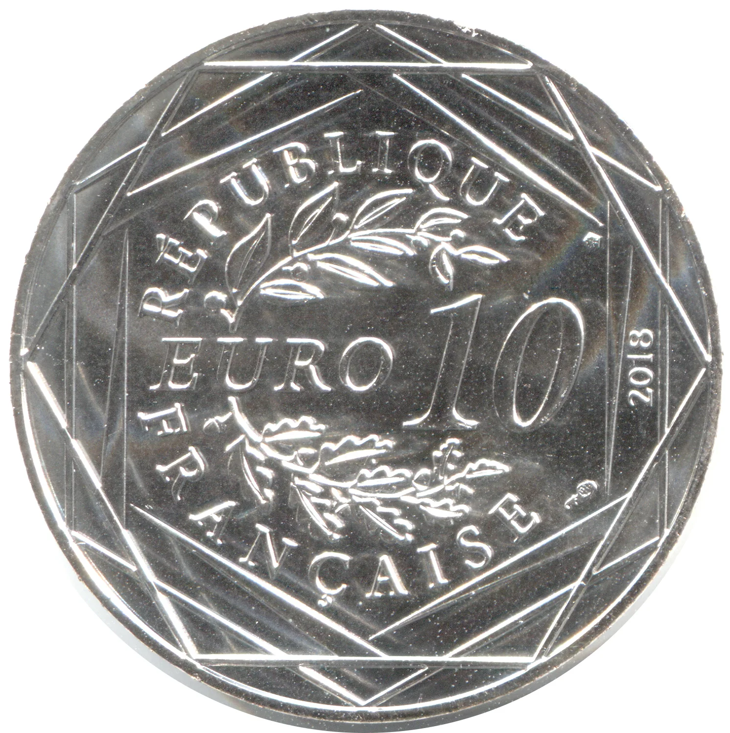 The obverse features the face value with oak and laurel branches, suggesting the Euro sign. The reverse motifs are framed by lines forming France's hexagon.