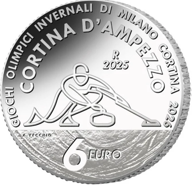 Central curling pictogram. Above: "GIOCHI OLIMPICI INVERNALI DI MILANO CORTINA 2026". Below: "CORTINAD'AMPEZZO". Left: "R" (Rome Mint) and "2025". Right: "6 EURO" and engraver's signature.