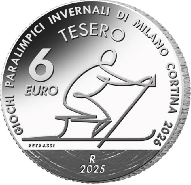 Central: Para cross-country skiing pictogram. Arching text: "GIOCHI PARALIMPICI INVERNALI DI MILANO CORTINA 2026" and host city "TESERO". Left: Value "6 EURO" and designer "PETRASSI". Bottom: Mint mark "R" and year "2025".