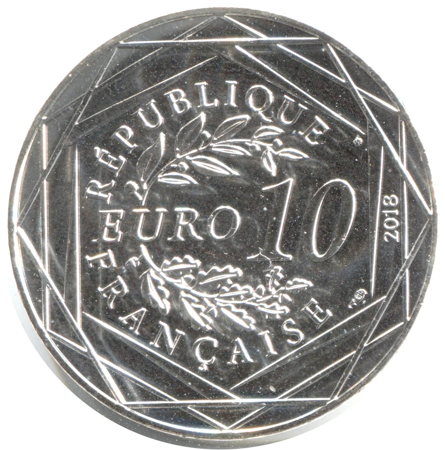 The obverse features the face value with oak and laurel branches, suggesting the Euro sign. The reverse motifs are framed by lines forming France's hexagon.