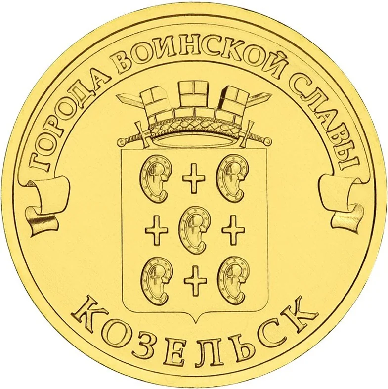 Kozelsk's coat of arms, above it on a ribbon: "ГОРОДА ВОИНСКОЙ СЛАВЫ", below along the rim: "КОЗЕЛЬСК".