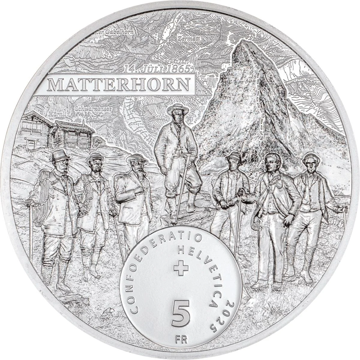Description: Edward Whymper's party, including Lord Francis Douglas, Charles Hudson, Douglas Hadow, Michel Croz, and guides Peter Taugwalder and his son, first ascended the Matterhorn on July 14, 1865.