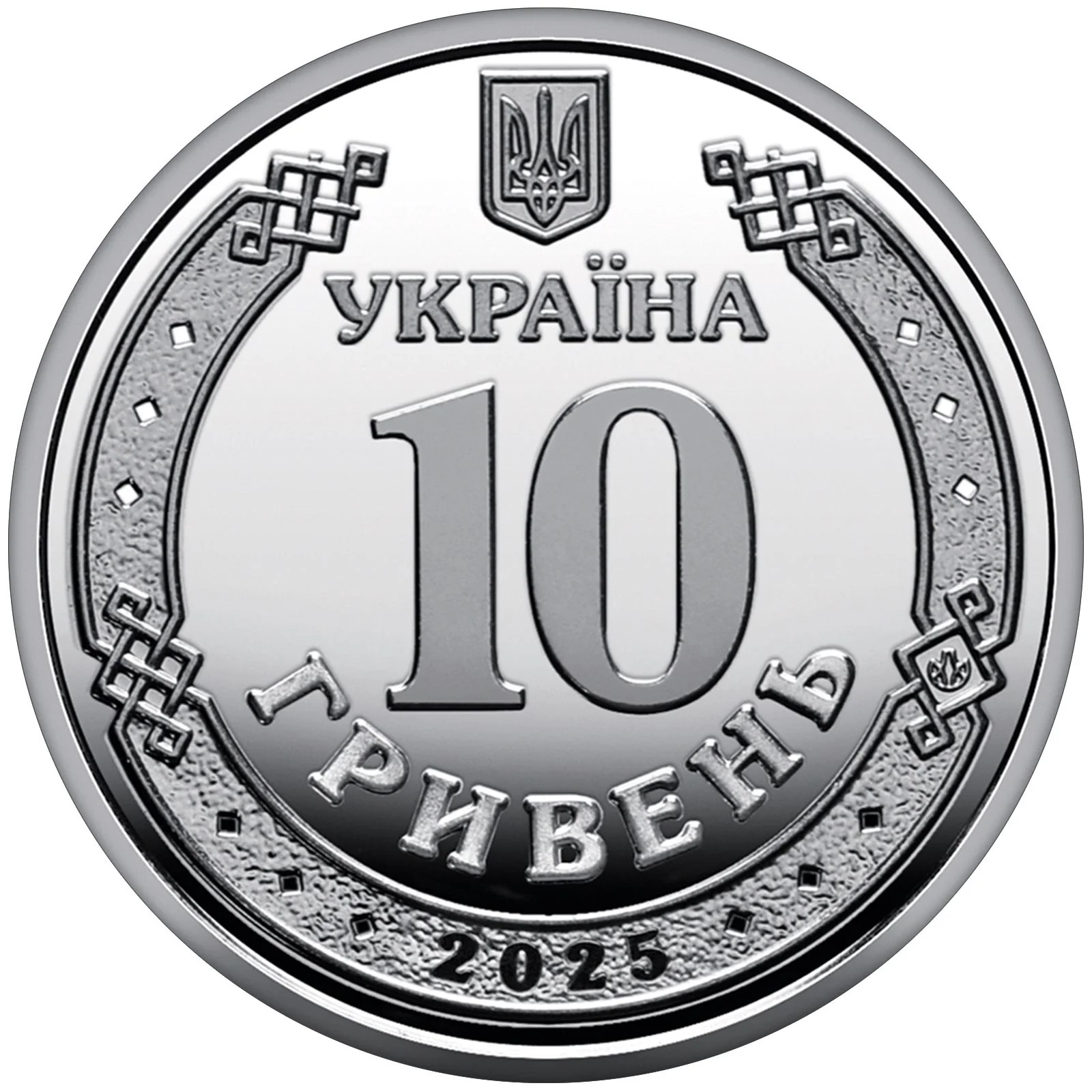 Ukraine's small coat of arms is above. Centered within an old Rus ornament is the semicircular inscription "УКРАЇНА/10/ГРИВЕНЬ." The ornament also displays the issue year 2025 below and the NBU mint mark to the right.