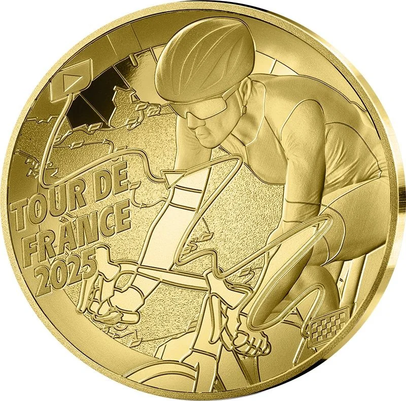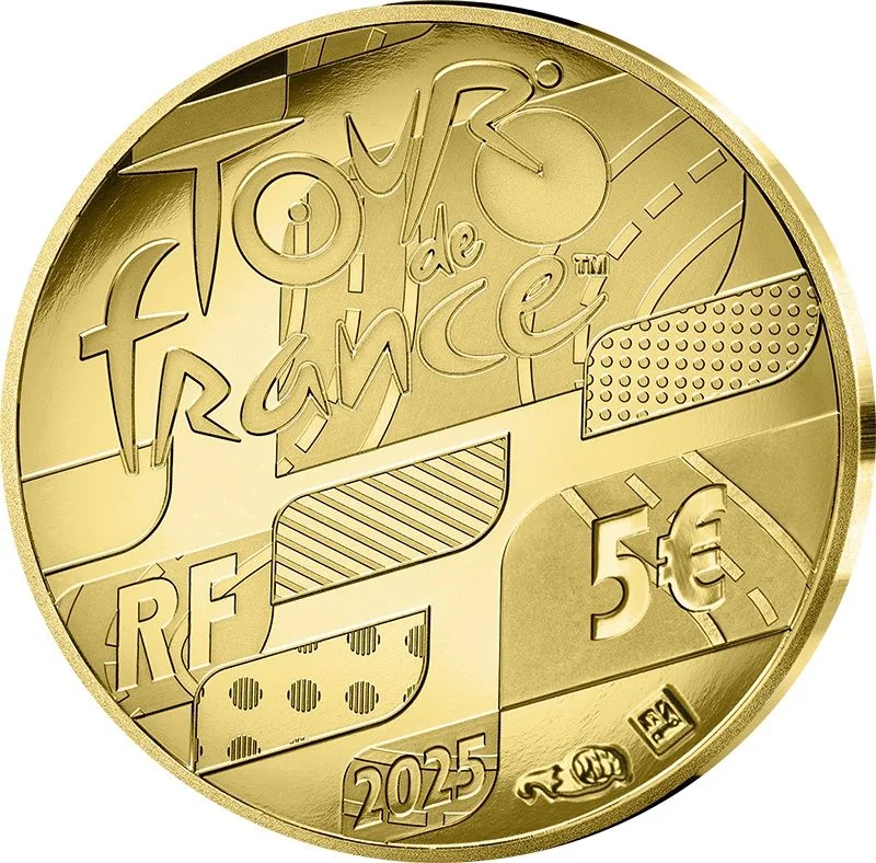 Les quatre maillots et le logo du Tour, le RF, la valeur et le millésime sur fond de route, avec les poinçons en bas.