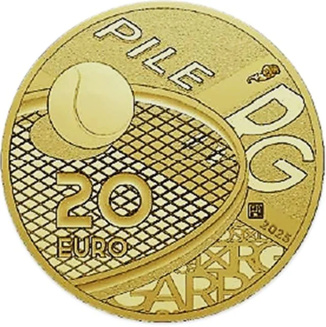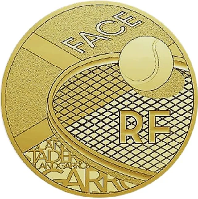 Ligne de fond de Roland-Garros, avec une raquette et une balle au centre. Valeur faciale et "PILE" visibles.