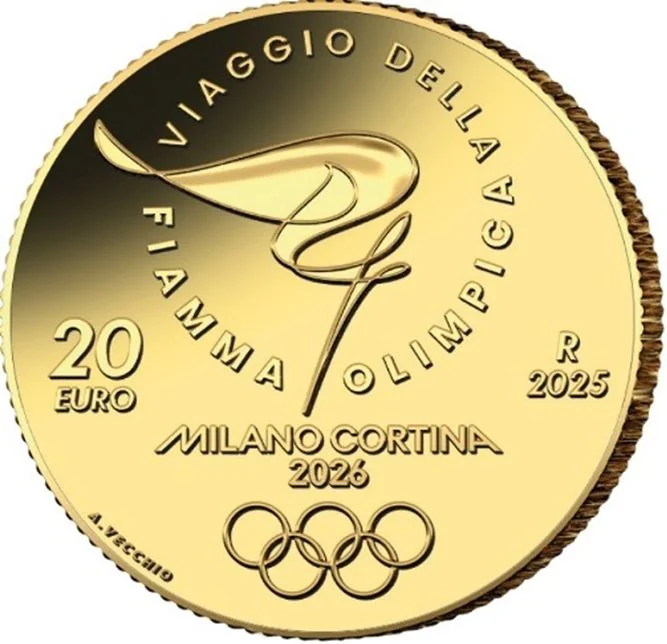Central Olympic flame logo with "VIAGGIO DELLA FIAMMA OLIMPICA". Left: "20 EURO". Right: mintmark "R" and year "2025". Designer's signature "A.VECCHIO" arches at bottom left.