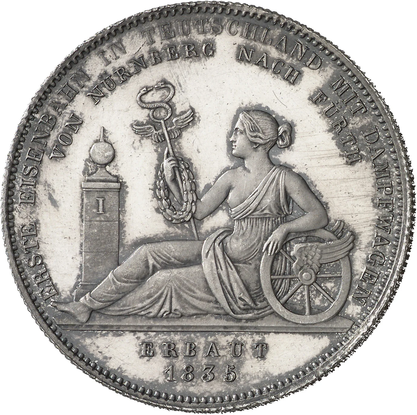 Inscription: ERSTE EISENBAHN IN TEUTSCHLAND MIT DAMPFWAGEN