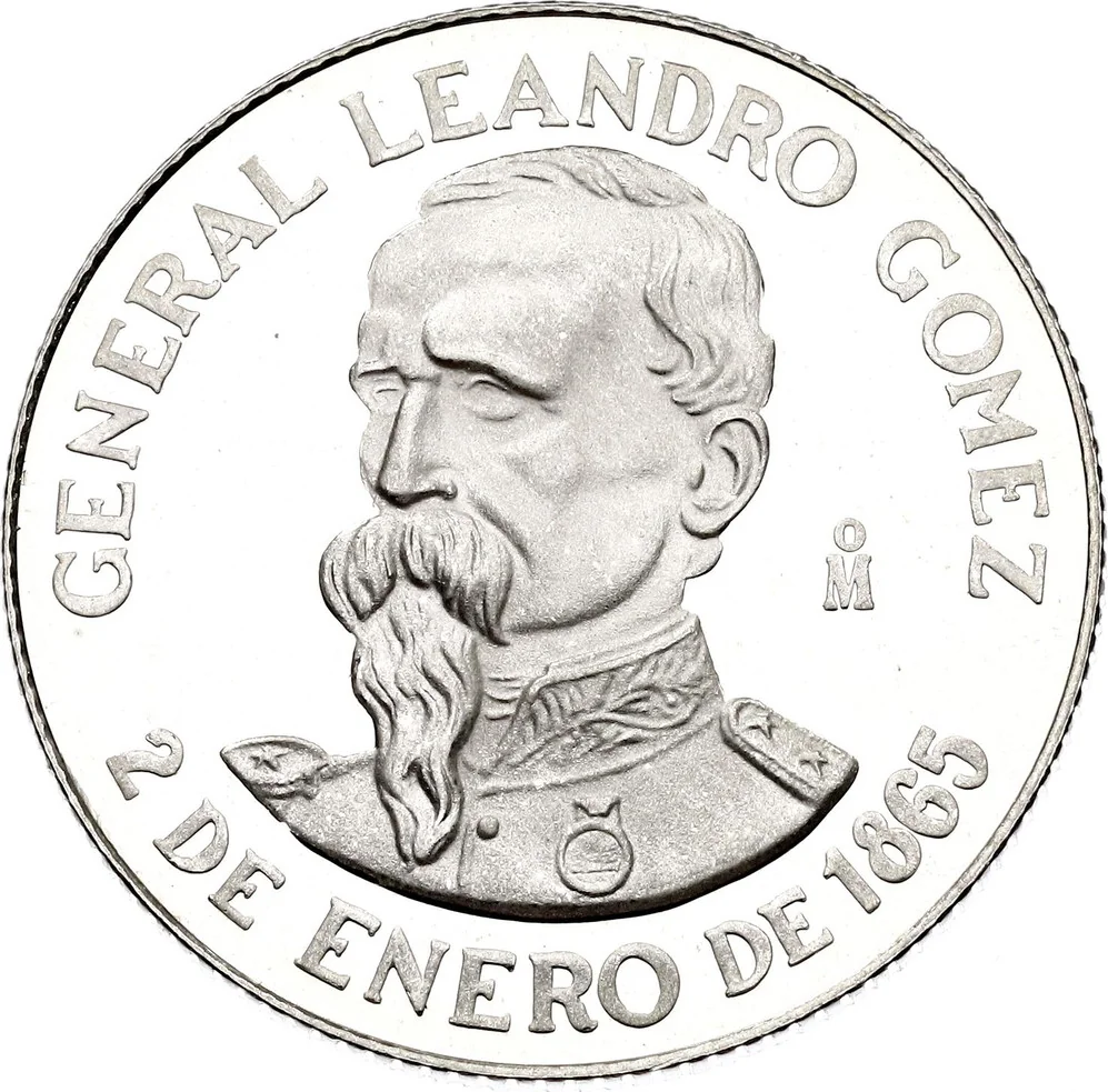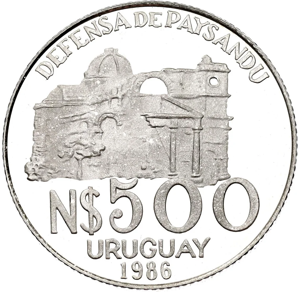 Description: Ruins of the Basilica of Paysandú, Uruguay, 1865. Colonel Leandro Gómez led the city's nearly year-long defense before its fall on 2 January 1865. He was executed after capture and later promoted to General posthumously. An original mintage of 3,000 coins was stolen in transit; 6,000 were subsequently struck.