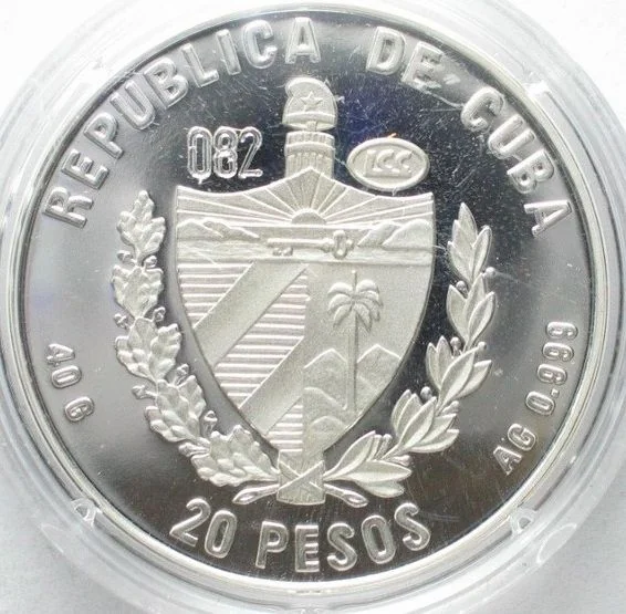 Cuban coat of arms, country name above, face value below, weight and fineness on sides. Numbered.