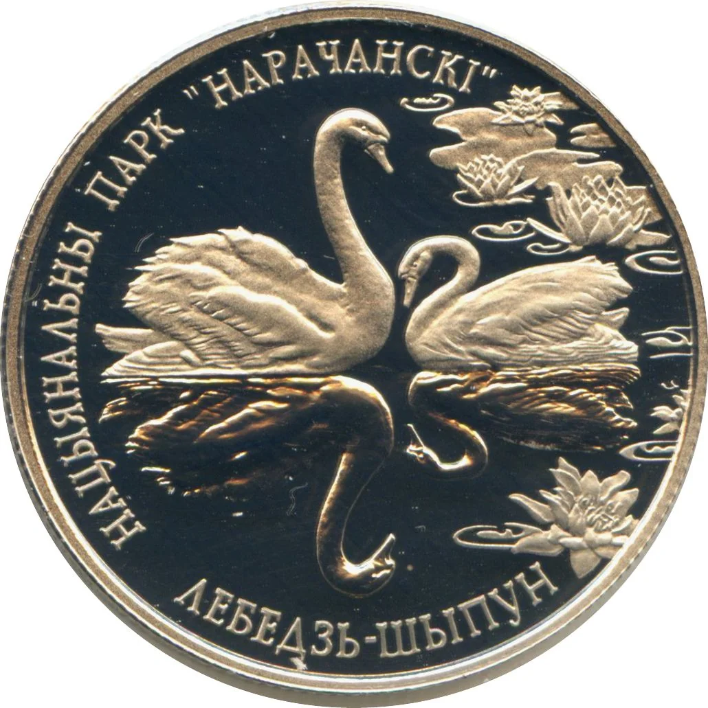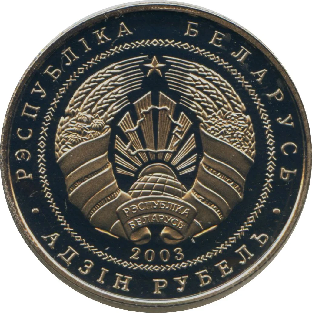 Description: The circular ornament features the relief of the State Coat of Arms, the year of issue below, and rim inscriptions: "РЭСПУБЛIКА БЕЛАРУСЬ" above and "АД3IН РУБЕЛЬ" below.