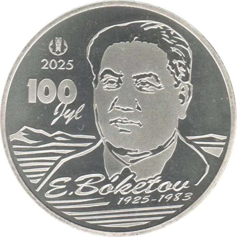 The center features Evnei Bóketov's portrait. To its left are the National Bank logo and issue year, with "100 Jyl" below. Beneath the portrait are "E. Bóketov" and his life years.