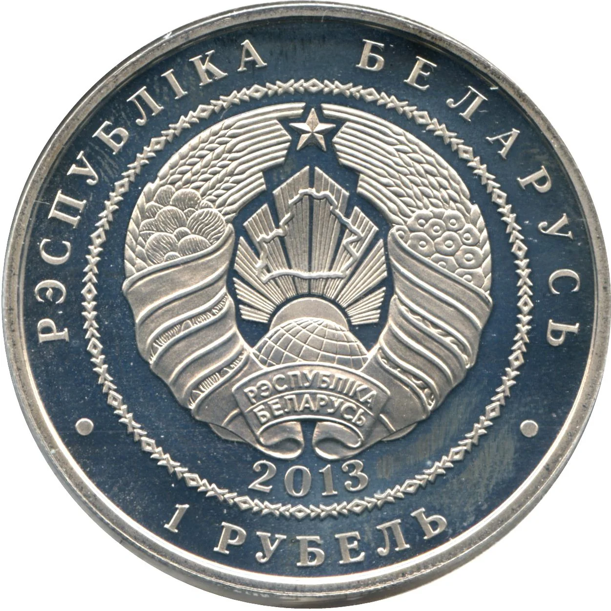The circular ornament features the relief of the State Coat of Arms, the year of issue below, and rim inscriptions: "РЭСПУБЛIКА БЕЛАРУСЬ" above and "1 РУБЕЛЬ" below.