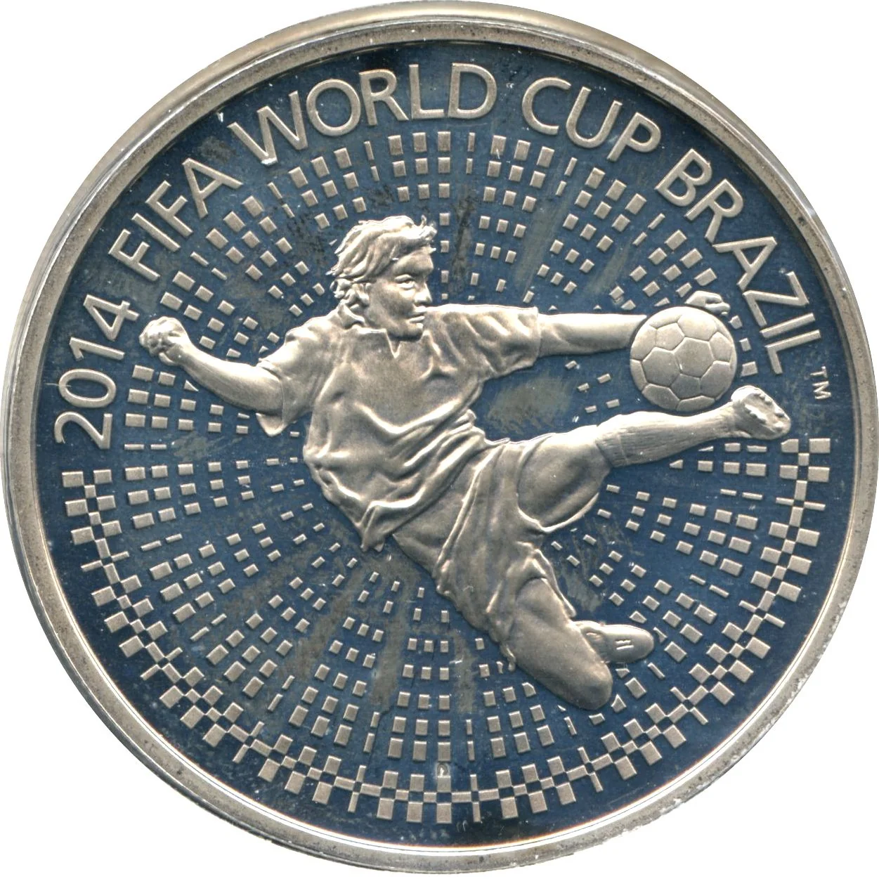 A football player strikes a ball mid-jump at the center, surrounded by the circumferential inscription: "2014 FIFA WORLD CUP BRAZIL TM".