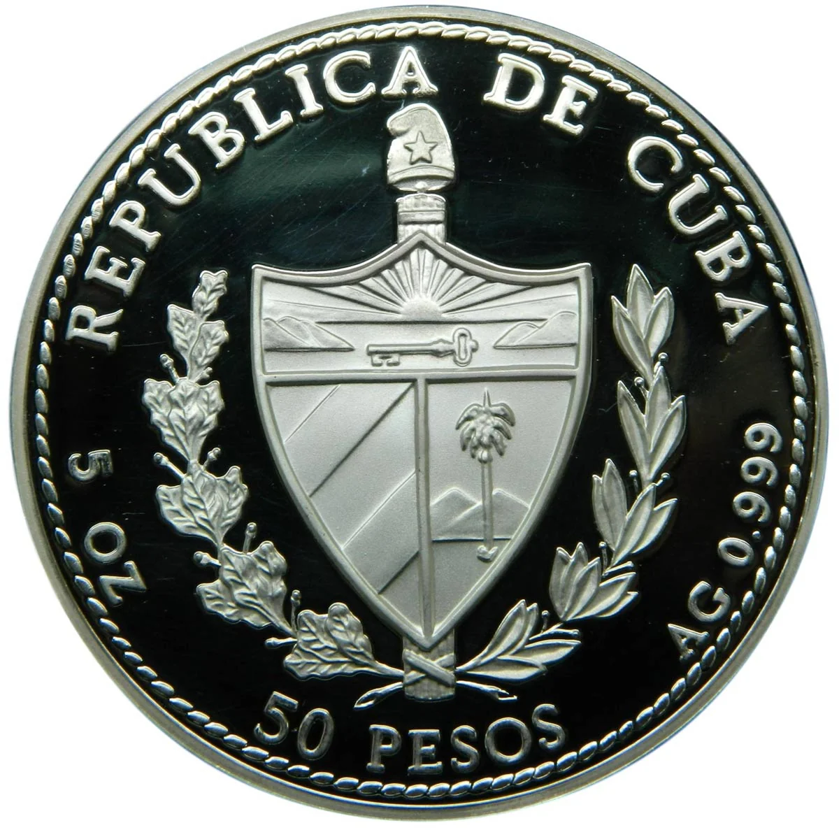 Cuban coat of arms with country name above, face value below, and weight and fineness on the sides.