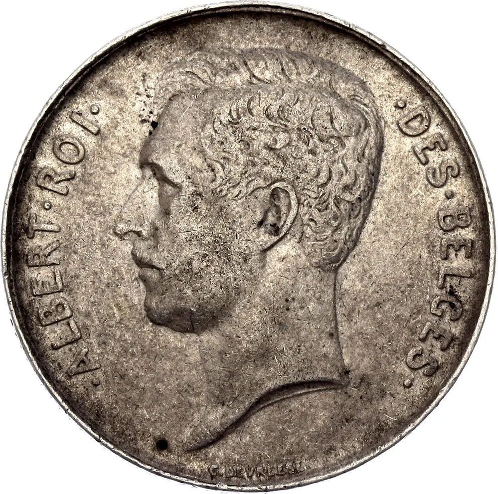 King Albert I in left profile, surrounded by French legend. Designer below.