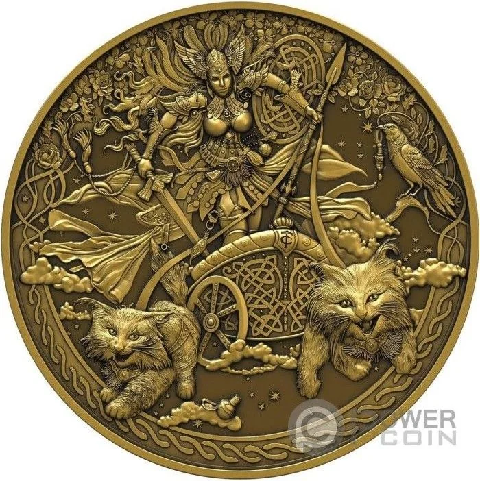 Freya, armored and winged, rides a chariot drawn by cats, armed with spear and sword.