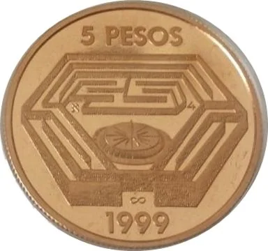 A labyrinth centers the design, with a sundial at its middle. Above is "5 PESOS"; below, the year "1999".