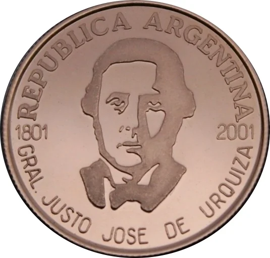 General Urquiza facing forward; to his left, "1801", and to his right, "2001". Above, "REPUBLICA ARGENTINA"; below, "Gral. JUSTO JOSE de URQUIZA".