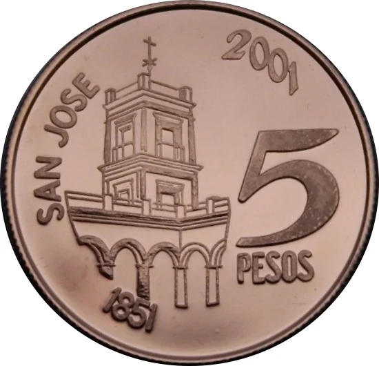 It depicts a sector of Estancia San José, with the face value "5 PESOS" and year "2001" opposite the commemorative year "1851". "SAN JOSE" appears inverted, and the coin's axis of rotation is vertical.