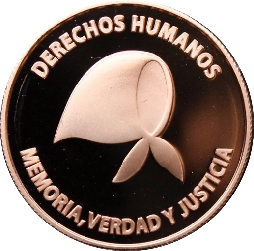 The central image is the handkerchief of the Mothers and Grandmothers of Plaza de Mayo, with "DERECHOS HUMANOS" above and "MEMORIA, VERDAD Y JUSTICIA" below.