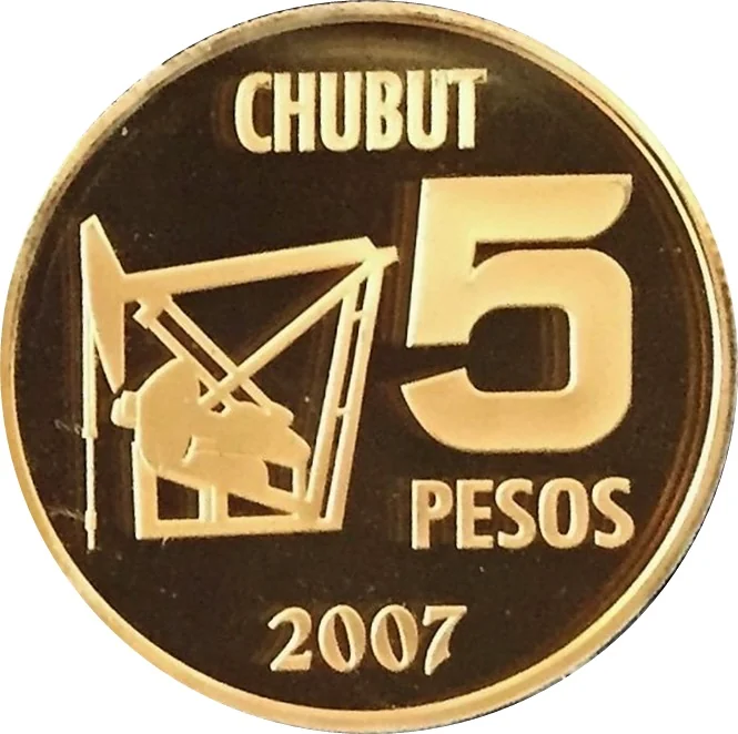 Left center: a punching machine. Right: the face value "5 PESOS". Top border: "CHUBUT". Exergue: the year "2007".
