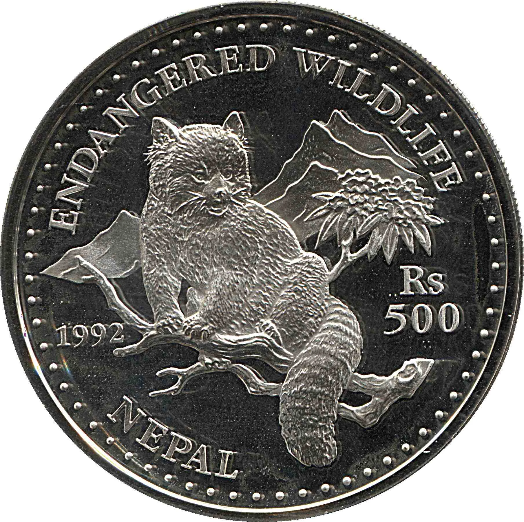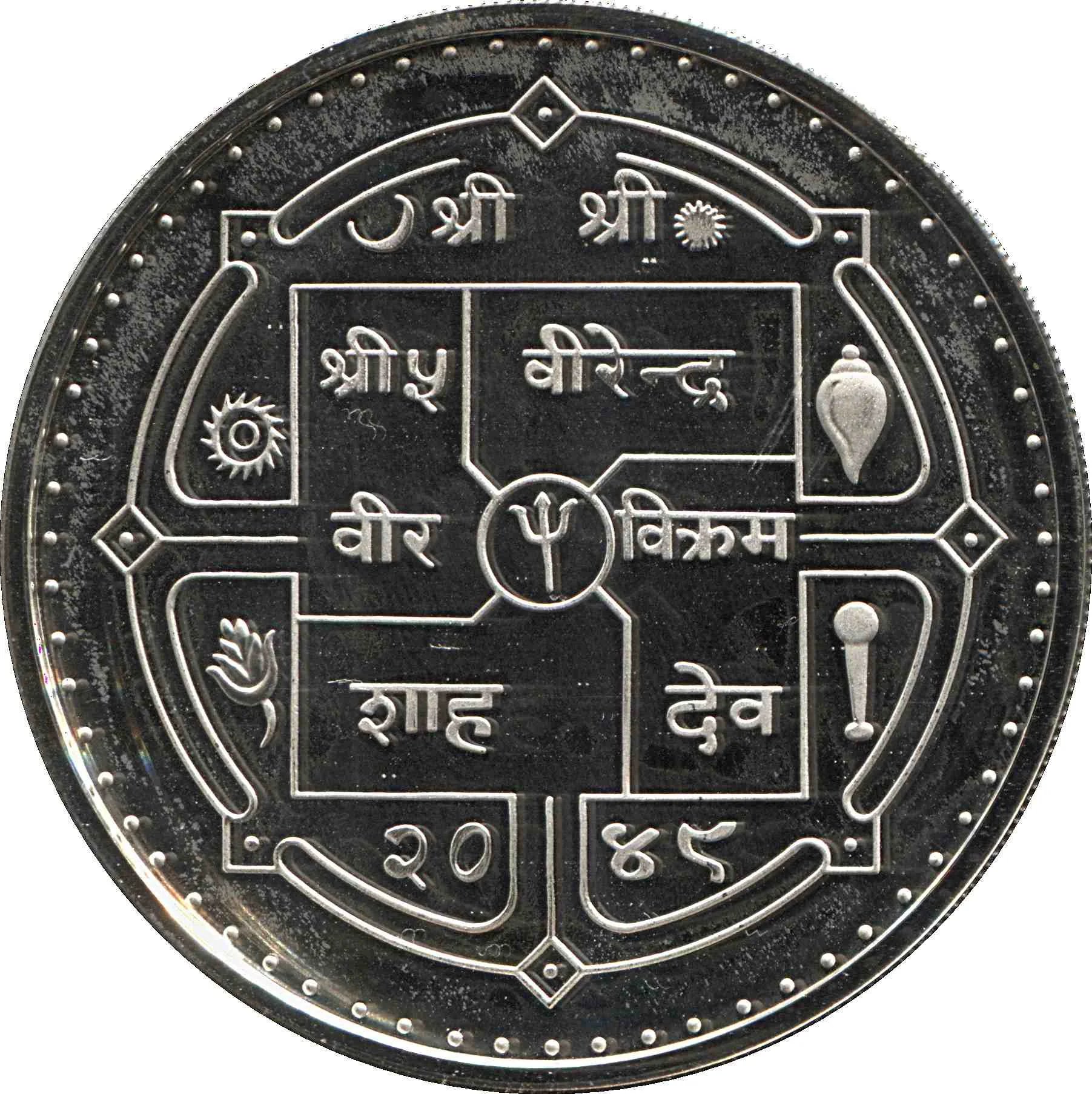 Description: The obverse features King Birendra Bir Bikram and Hindu symbols: the Chandra (moon) and Surya (sun) above, a central Trishul (trident), flanked by a Chakra (discus) and Sankha (conch), with a Padma (lotus) and Gada (mace) below.