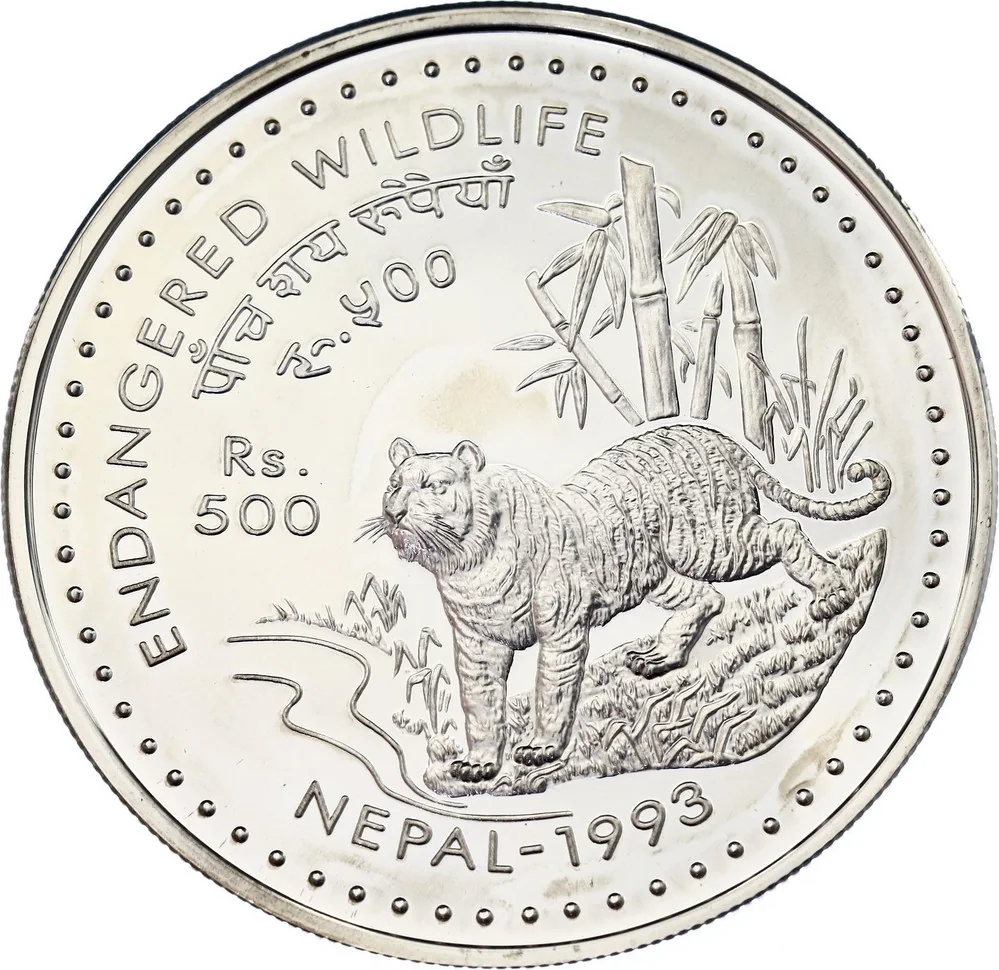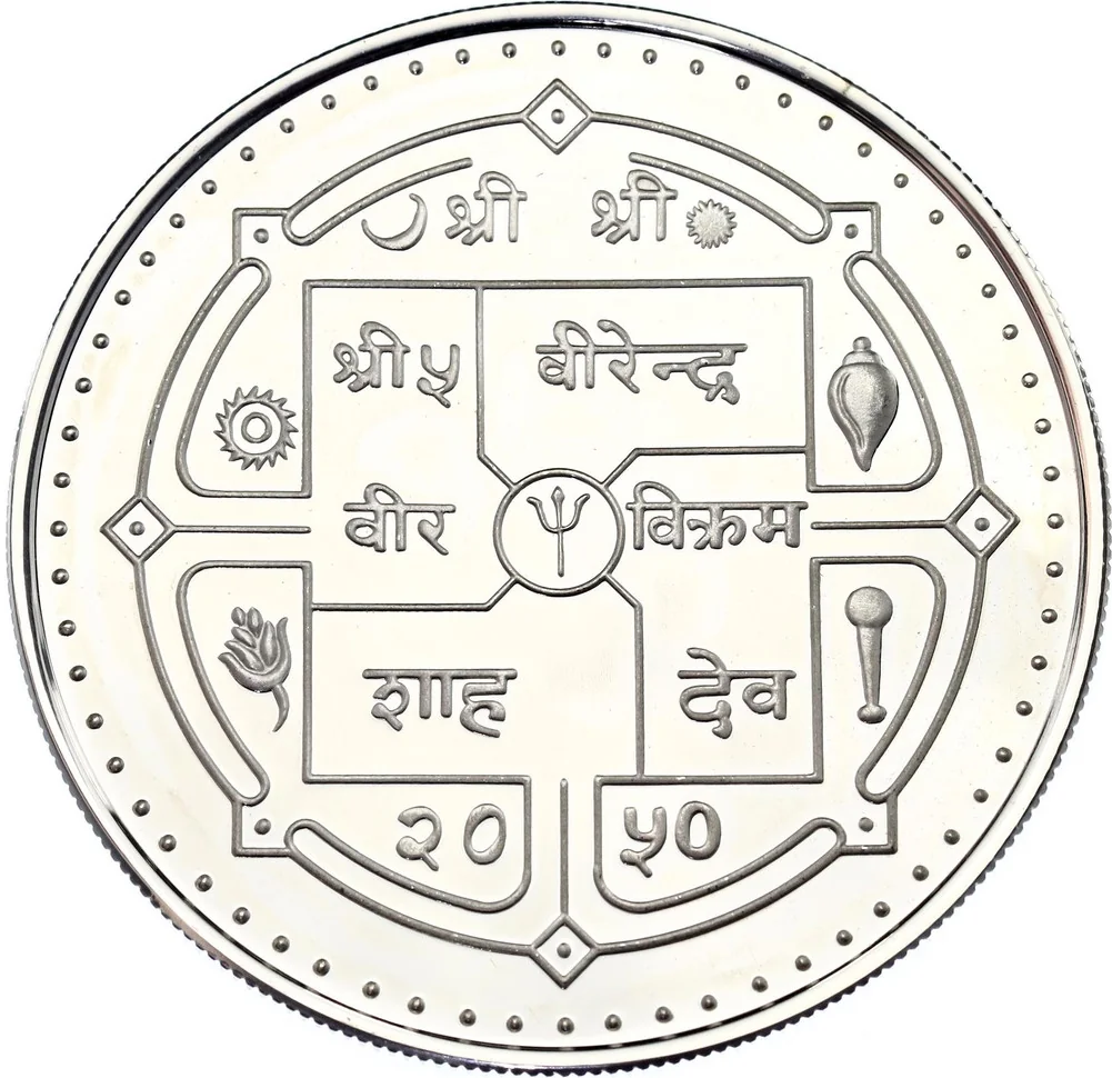 Description: The obverse features King Birendra Bir Bikram's name, flanked by the Chandra (moon) and Surya (sun). A central circle contains a Trishul (trident), with a Chakra (discus) and Sankha (conch) to its sides, and a Padma (lotus) and Gada (mace) below.