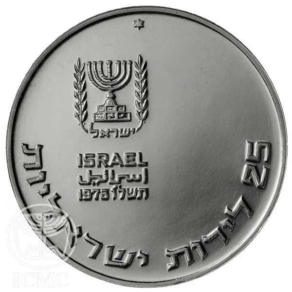 Face value "25 Israeli Lirot" in Hebrew along the bottom. Upper left: State emblem. Below: "Israel" in Hebrew, English, and Arabic, with the year 1976 (5736). Mintmark at top center.
