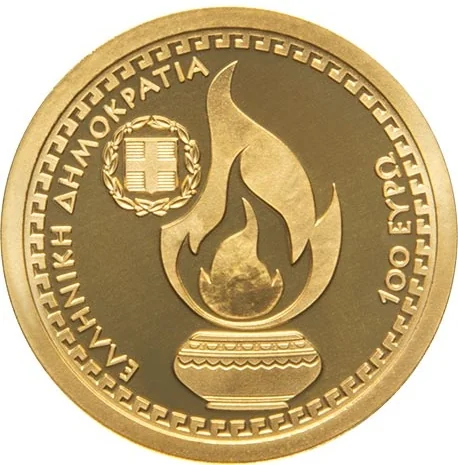 (fr) Armoiries de la Grèce sur fond de flamme.