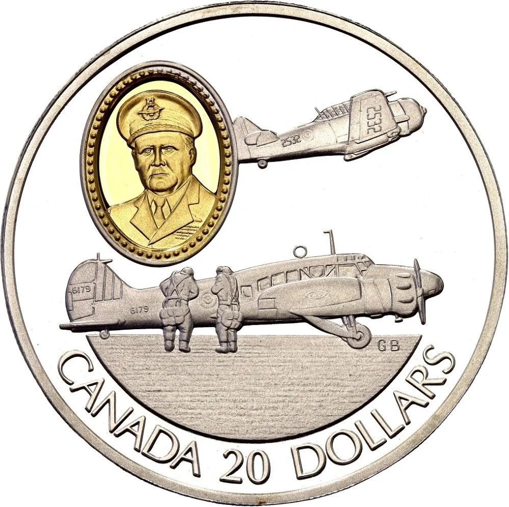 Avro Anson and Harvard aircraft, Air Marshal Robert Leckie in 24-karat gold cameo, with denomination below.