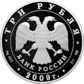 Center: Bank of Russia emblem (two-headed eagle, wings down, with "БАНК РОССИИ" below), within a dotted circle. Rim inscriptions: top - "ТРИ РУБЛЯ"; bottom left - metal and fineness; center - "2009 г."; bottom right - metal content and mint mark.