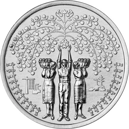 An allegorical fruit tree with figures of a man (gear) and two women (harvest baskets) at its center, flanked by symbols of industry and agriculture, above a circle of dancing figures.