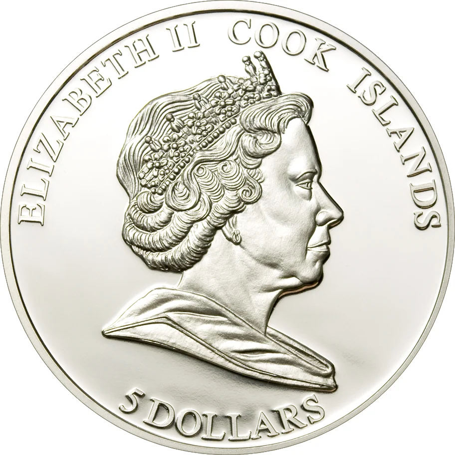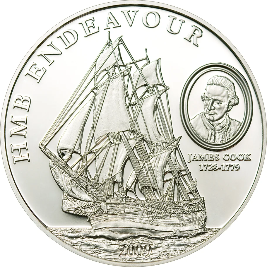 Sailing ship "Endeavour" with a portrait of James Cook.