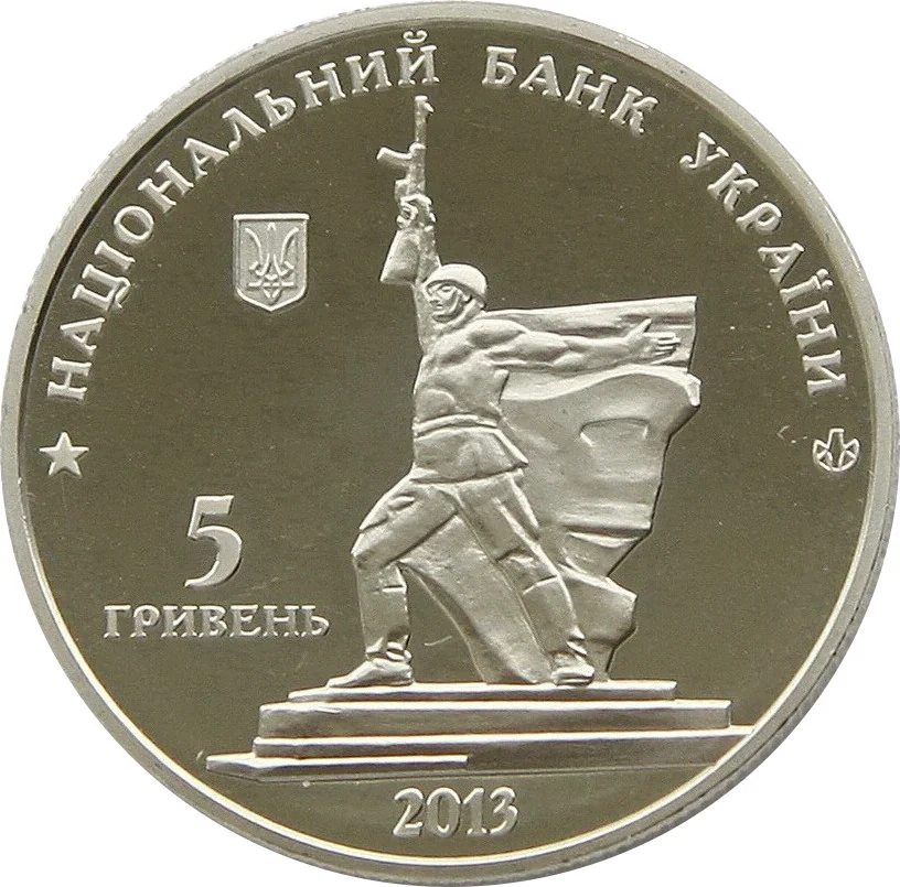 Above, a semicircular inscription reads "НАЦІОНАЛЬНИЙ БАНК УКРАЇНИ" with the Small Coat of Arms below it on the left. The center features the Liberator Warrior monument, below which is the year 2013. On the left is the face value "5 ГРИВЕНЬ," and on the right is the Mint mark.