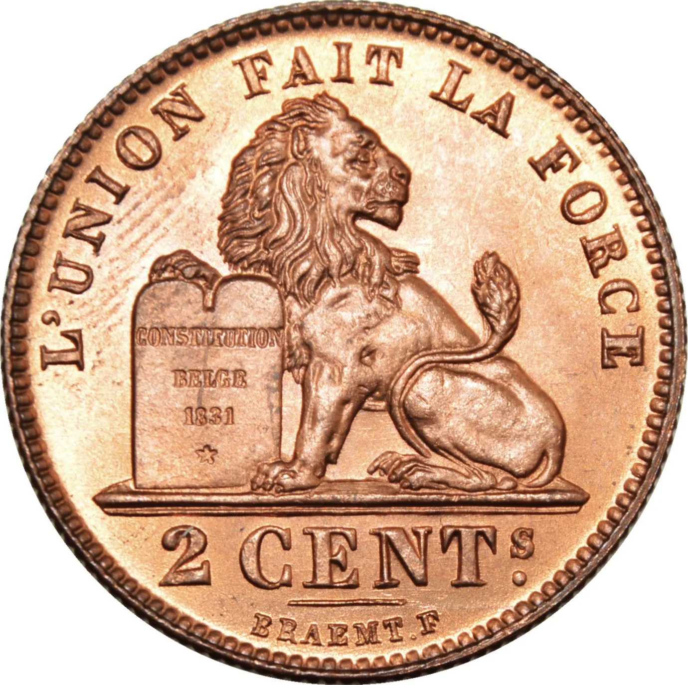 Belgian lion with paw on 1831 Constitution, surrounded by French motto. Value and designer below.