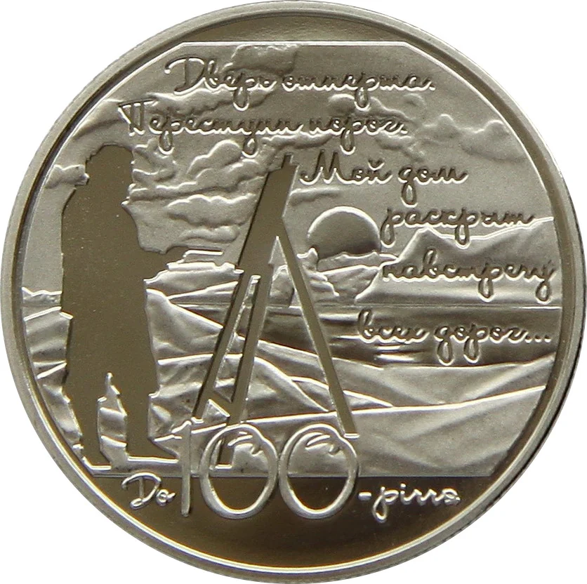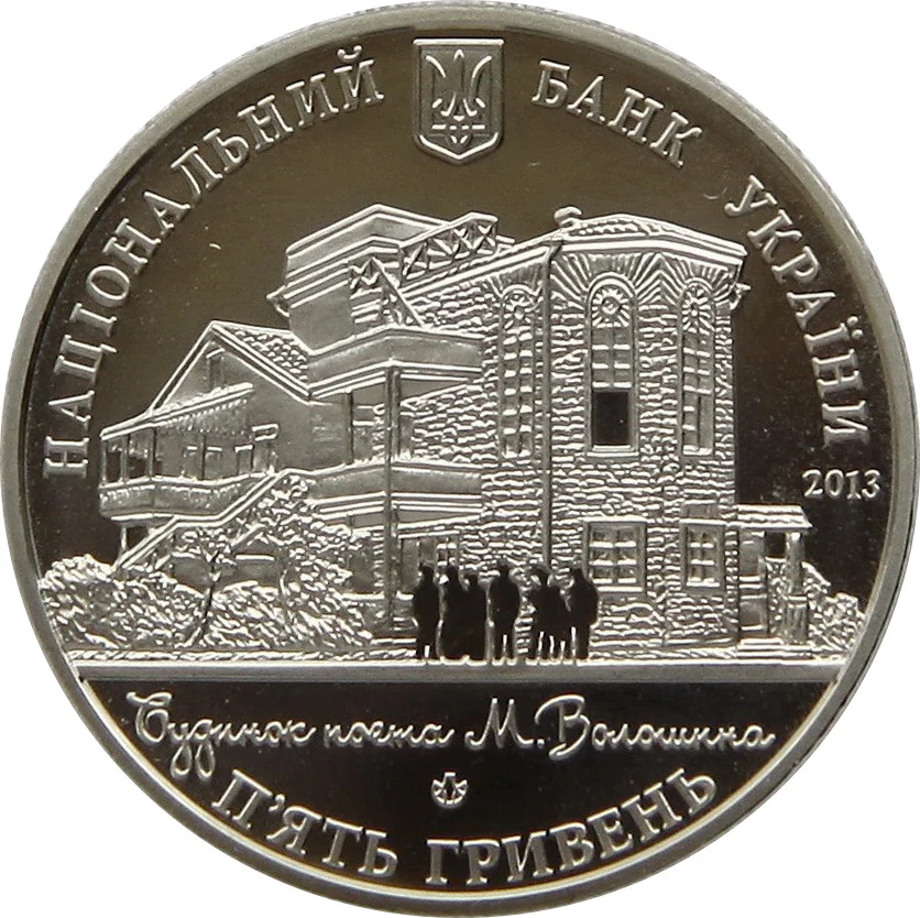 The obverse features Ukraine's Small Coat of Arms and the inscription "НАЦІОНАЛЬНИЙ БАНК УКРАЇНИ". The central reverse depicts the House of the Poet, with silhouettes symbolizing hospitality, above the inscription "БУДИНОК ПОЕТА М.ВОЛОШИНА" and the year 2013. At the bottom are the Mint mark and the face value "П'ЯТЬ ГРИВЕНЬ".
