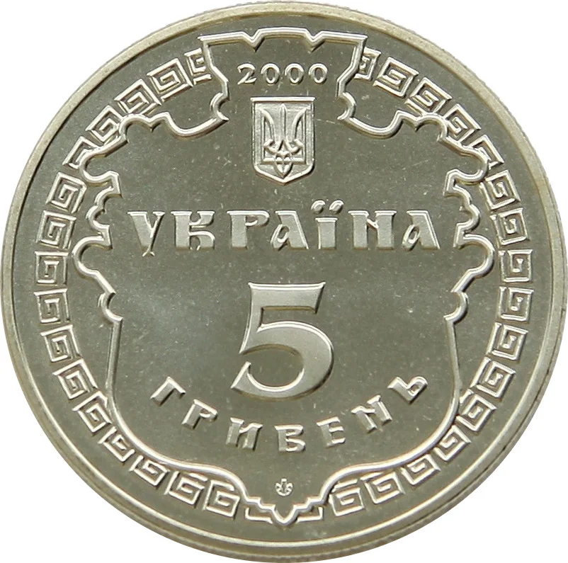 The Small State Emblem of Ukraine is set within a Greek-style heraldic cartouche, accompanied by the inscriptions: 2000, УКРАЇНА, 5, ГРИВЕНЬ, and the inaugural mintmark of the National Bank of Ukraine Mint.