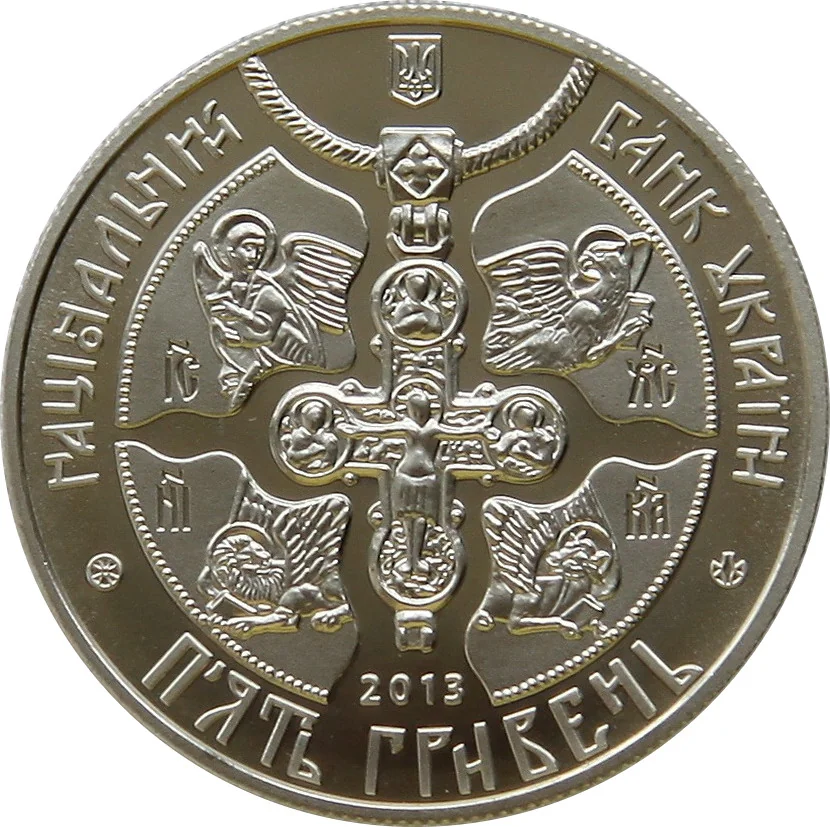 The obverse features Ukraine's Small Coat of Arms with the National Bank legend, the year 2013, the face value of five hryvnias, and the mint mark. The central design shows an encolpion flanked by the four winged symbols of the Evangelists: an angel (Matthew), a lion (Mark), an ox (Luke), and an eagle (John), each holding a Gospel.