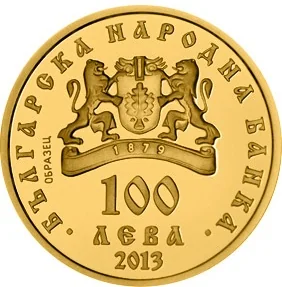 Description: The obverse shows the BNB logo, the year '1879', the nominal value '100 ЛЕВА', and the issue year '2013', encircled by 'БЪЛГАРСКА НАРОДНА БАНКА'.