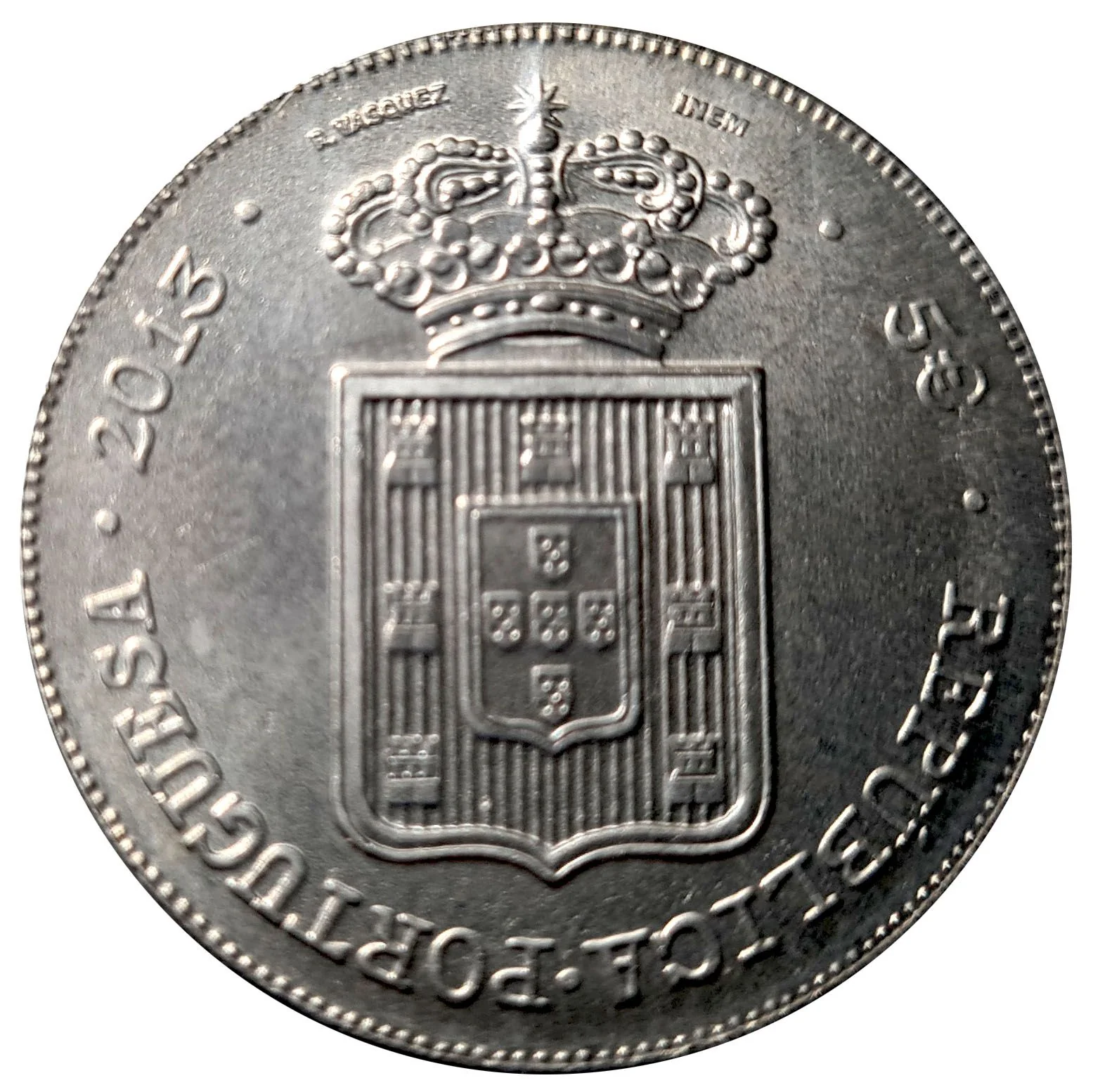 Portuguese coat of arms from the reign of Maria II, encircled by "REPÚBLICA PORTUGUESA," the year, "5€," the engraver's signature "R. VASQUEZ," and the mint letters "INCM."