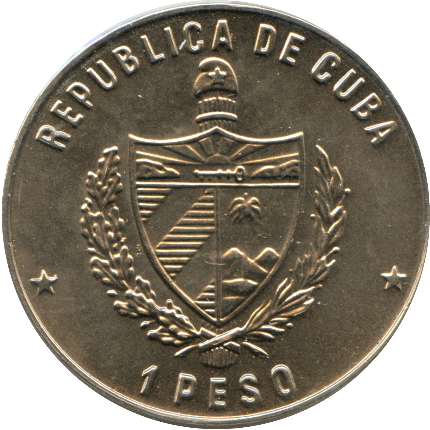 Cuban coat of arms with curved country name above, face value below, flanked by two five-pointed stars.