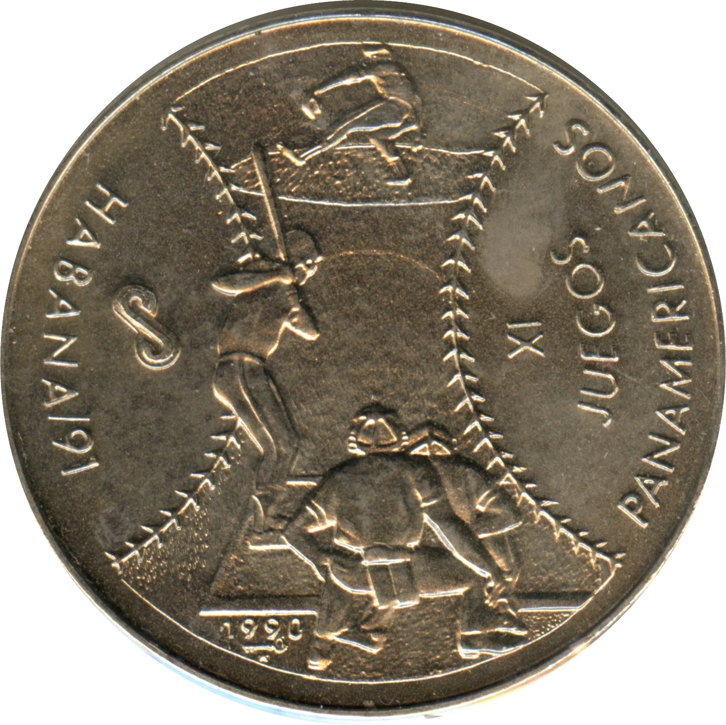 Baseball game scene. On right, curved 90° event name on three lines. On left, curved 90° logo and place. Issue date and mintmark below image, left.