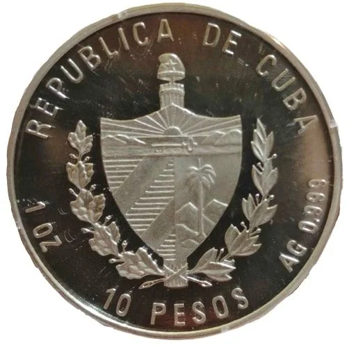 Cuban arms. Country above, face value below, weight and fineness on sides.