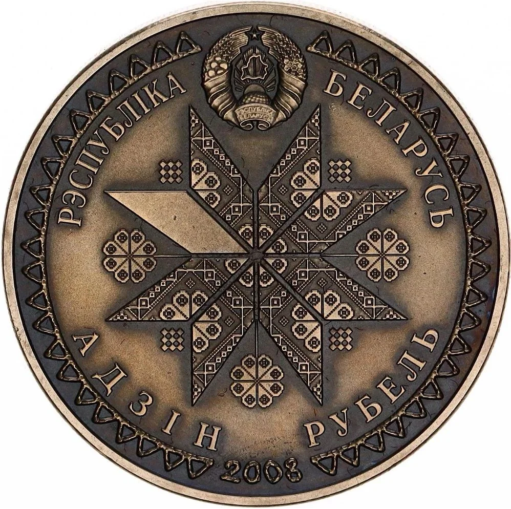 Description: A relief of the Belarusian State Coat of Arms within a circle, surrounded by geometric ornament. The center features a solar sign—an octagonal pattern with decorative rays. Below is the year of issue. Circumferential inscriptions: "РЭСПУБЛИКА БЕЛАРУСЬ" (THE REPUBLIC OF BELARUS) above and "АДЗІН РУБЕЛЬ" (ONE RUBLE) below.