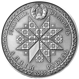 A circular relief of the Belarusian State Coat of Arms, surrounded by a geometric ornament. The center features a solar sign with an octagonal pattern. Below is the year of issue. Circumferential inscriptions: "РЭСПУБЛІКА БЕЛАРУСЬ" (top) and "АДЗІН РУБЕЛЬ" (bottom).